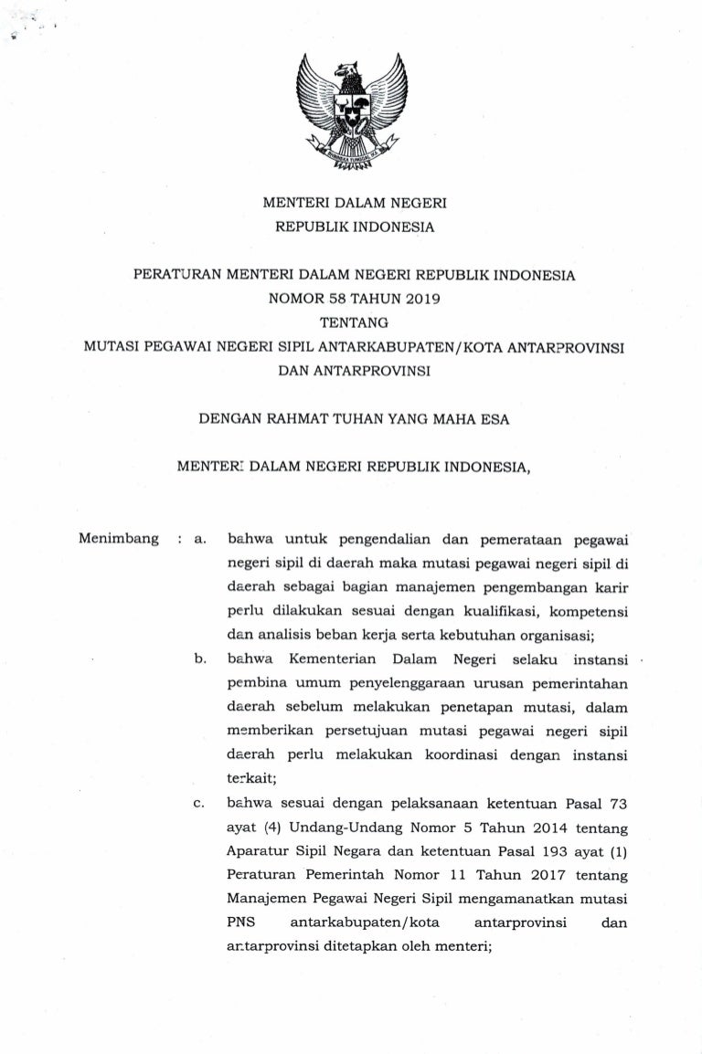 Permendagri 58 Tahun 2019 Tentang Mutasi Pns Antarkabupaten Kota Anta