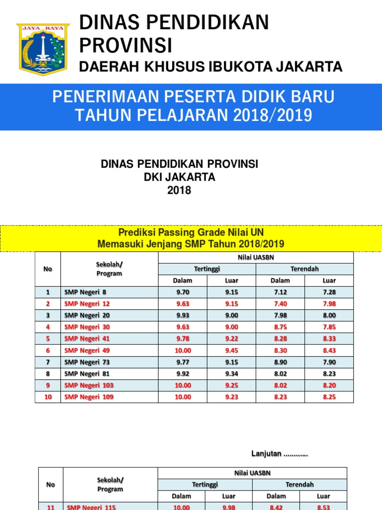 INFO PASSING GRADE SMP NEGERI JAKARTA PPDB 2019 Oleh kkaktri 14 Jun 2019 Kkaktri Channel Berikut Kami Infokan PASSING GRADE SMP NEGERI JAKARTA PPDB 2019 gambaran untuk peluang kalian masuk SMP negeri di jakarta untuk info lengkap PASSING GRADE PPDB 2019 SMP dari sumber PPDB 2018 silahkan cek disini. 102 rows Kali ini k-blog share hasil seleksi PPDB SMP Negeri DKI Jakarta passing grade tahun 2019 yang telah dilaksanakan tanggal 24 Juni 2019 sd 11 Juli 2019 yang lalu. SMPN 98 Jakarta passing grade terendah 816 tertinggi 95 7.