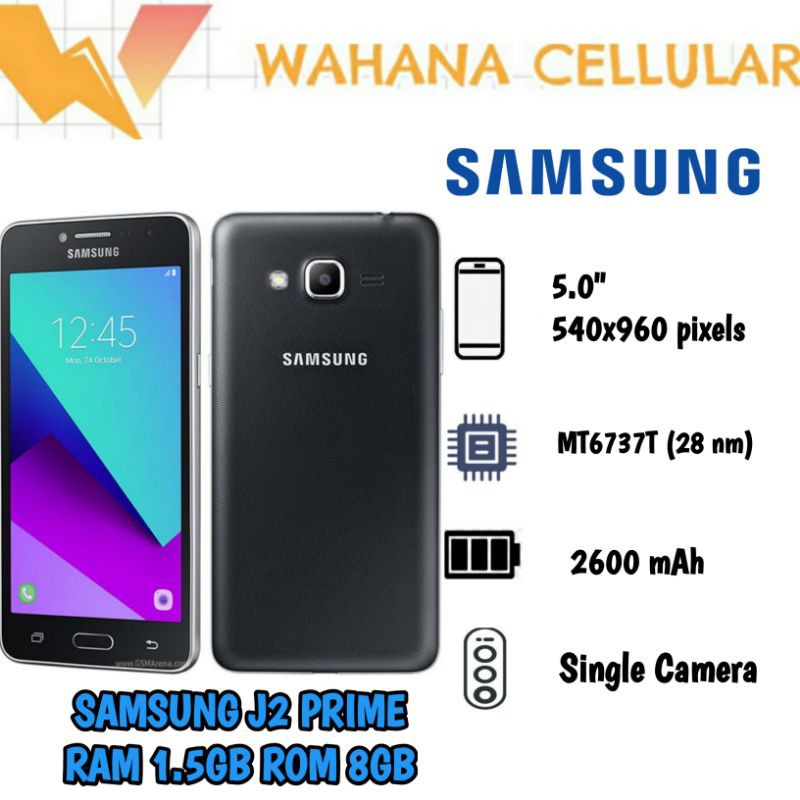 Secara spesifikasi Galaxy J2 Prime menghadirkan konektivitas 4G dan VoLTE layar 5 inch beresolusi qHD 960 x 540 piksel prosesor quad-core MediaTek MT6737T 14GHz RAM 15GB bersistem operasi Android 60 Marshmallow kamera utama 8 MP dan baterai 2600 mAh. Sama seperti hp android harga satu jutaan pada umumnya Samsung J2 Prime hadir dengan mengusung layar berukuran 50 inci berjenis PLS TFT. Gadgetren Pada tahun 2016 silam Samsung secara resmi meluncurkan smartphone dengan harga terjangkau yang bernama Galaxy J2 Prime.