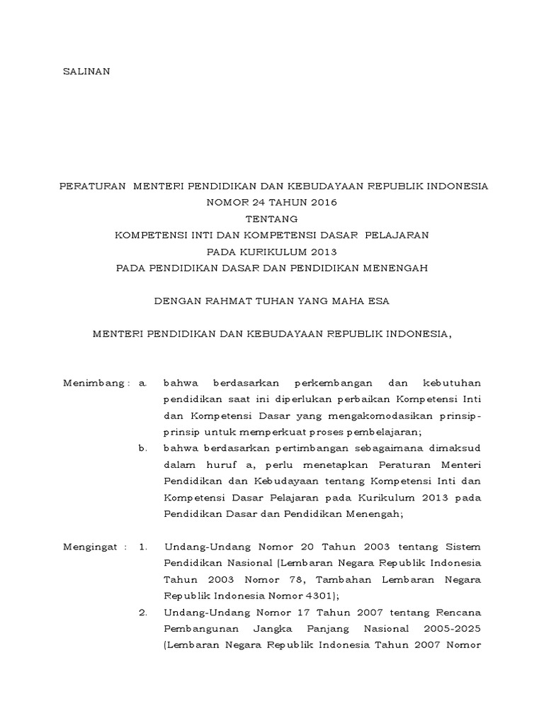 Download Permendikbud Nomor 24 Tahun 2016 Tentang Kompetensi Inti Dan Kompetensi Dasar Pelajaran Kurikulum 2013 Sd Mi Smp Mts Sma Ma Dan Smk Mak Website Pendidikan