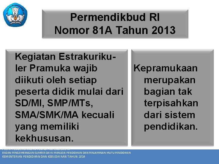 Permendikbud RI Nomor 81A Tahun 2013 Tentang Implementasi Kurikulum 2013 - Pedoman Pelaksanaan K-13. NOMOR 81 TAHUN 2013 TENTANG PENDIRIAN SATUAN PENDIDIKAN NONFORMAL DENGAN RAHMAT TUHAN YANG MAHA ESA MENTERI PENDIDIKAN DAN KEBUDAYAAN REPUBLIK INDONESIA Menimbang. Penjelasan tentang layanan bimbingan dan konseling dalam Implementasi Kurikulum 2013 telah dituangkan dalam Peraturan Menteri Pendidikan dan Kebudayaan Nomor 81A Tahun 2013.