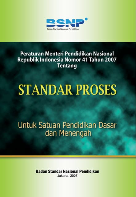 Bahwa dalam rangka pelaksanaan ketentuan Pasal 24 Peraturan Pemerintah Nomor 19 Tahun 2005 tentang Standar Nasional. NOMOR 41 TAHUN 2007 TENTANG STANDAR PROSES UNTUK SATUAN PENDIDIKAN DASAR DAN MENENGAH DENGAN RAHMAT TUHAN YANG MAHA ESA MENTERI PENDIDIKAN NASIONAl Menimbang. Sesuai dengan amanat Peraturan Pemerintah Nomor 19 tahun 2005 tentang Standar Nasional Pendidikan salah satu standar yang harus dikembangkan adalah standar proses.