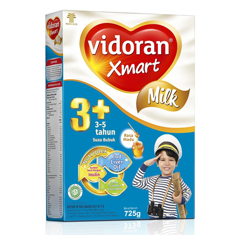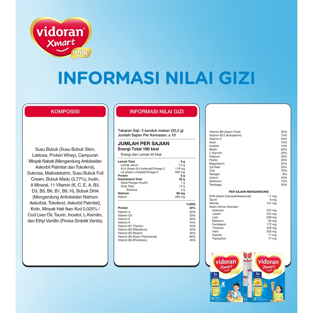 Susu vidoran Xmart 1 untuk usia 1-3 tahun. Mengandung Minyak Hati Ikan Cod yang mengandung Omega 3 DHA EPA Vitamin A D dimana berguna untuk membantu mengoptimalkan kecerdasan meningkatkan daya tahan dan pertumbuhan Mengandung Kolin Taurin L-Carnitine. Kandungan lain dalam susu bayi ini adalah nutrisi ALA dan LA.