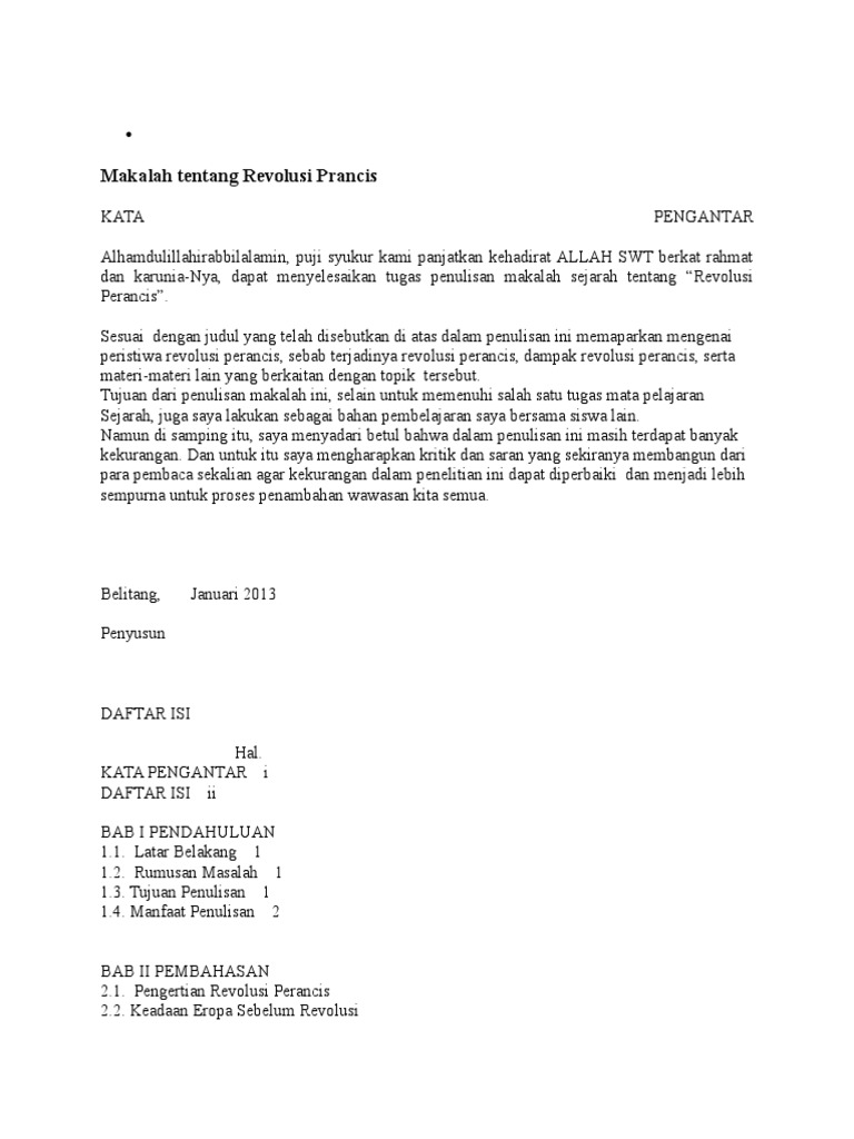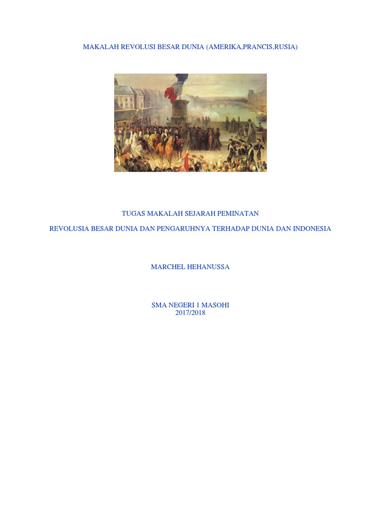 Makalah revolusi prancis. Makalah Tentang Pengaruh Revolusi Perancis Terhadap Pergerakan Indonesia mengupas tentang keterkaitan antara Revolusi Perancis yang menjadi acuan pergerakan nasional di Indonesia. Sebagai sebuah konsepmakalah yang berjudul Sejarah Revolusi Perancisini dikategorikan sebagai sejarah Eropa karena terjadi dalam ruang lingkup wilayah tertentu di benua EropaOleh karena itukita sebagai negara yang menyadari hakekat dari sejarah gemilang suatu bangsahendaknya dapat menjadikan inspirasi dari kebebasan yang merupakan semangat dari kedua revolusi. Liberte egalite fraternite kebebasan persamaan persaudaraan.