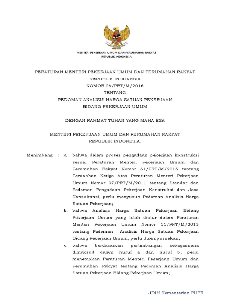 Permen Pu No 28 Tahun 2016 - Slideshare uses cookies to improve functionality and performance and to provide you with relevant advertising. Dengan ditetapkannya Peraturan Menteri Pekerjaan Umum Perumahan Rakyat 28PRTM2016 Tentang Pedoman Analisis Harga Satuan Pekerjaan Bidang Pekerjaan Umum pada tanggal 1 Agustus 2016 dan diundangkan pada tanggal 8 Agustus 2016 maka Peraturan Menteri Pekerjaan Umum Nomor 11PRTM2013 dinyatakan dicabut dan tidak berlaku lagi.